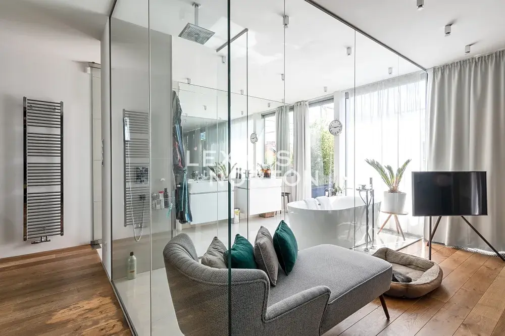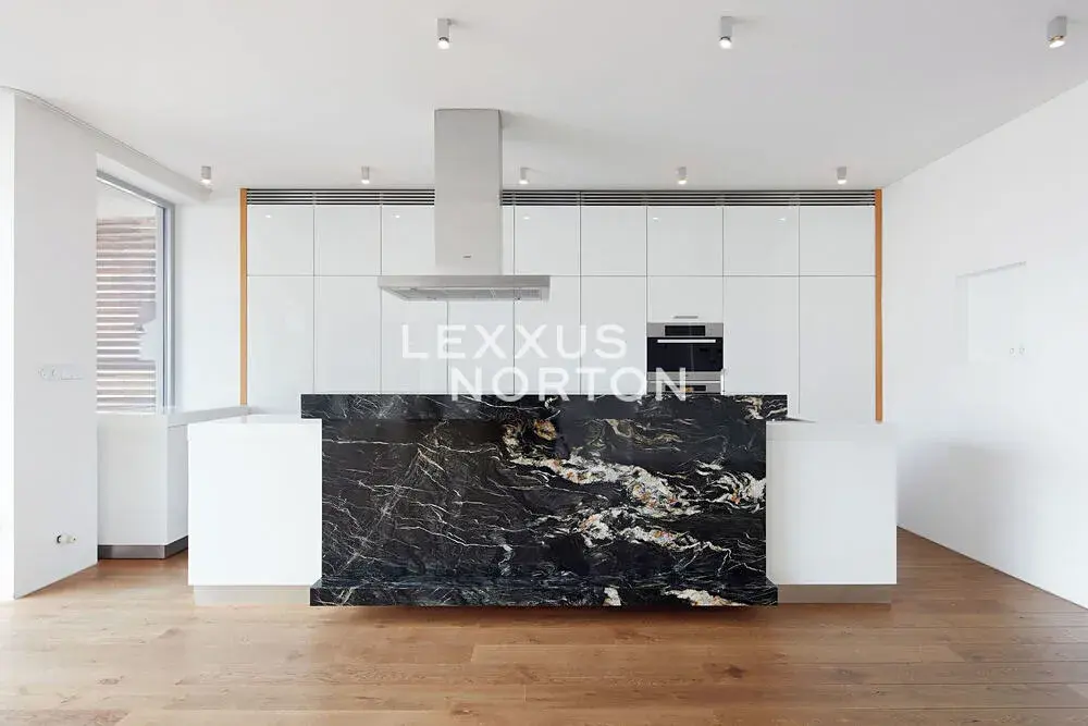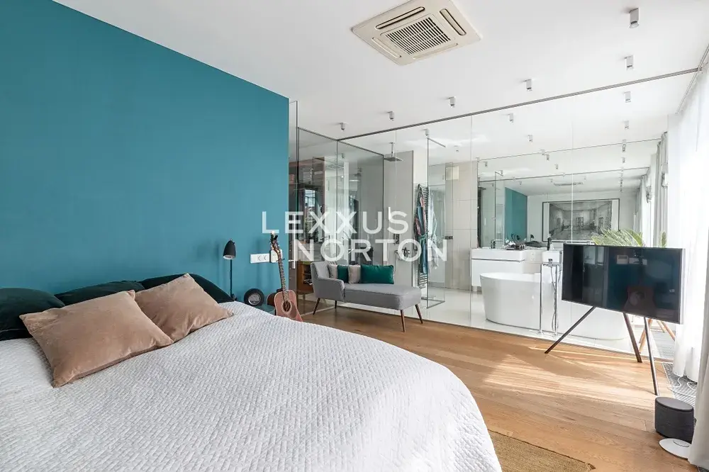 Dominantou bytu je velkorysý obývací pokoj o rozloze 101 m2 s unikátním závěsným krbem a luxusní kuchyňskou linkou vybavenou vestavěnými spotřebiči značky Miele – lednicí s mrazákem, varnou deskou, troubou, mikrovlnnou troubou a myčkou nádobí. Koupelny jsou vybaveny vanou, walk-in sprchou a dvěma umyvadly, u samostatné toalety se nachází i bidet. K nadstandardnímu vybavení bytu dále patří pračka a sušička, vestavěné skříně, kvalitní dřevěné podlahy, bezpečnostní vstupní dveře, alarm s možností napojení na PCO a videotelefon.