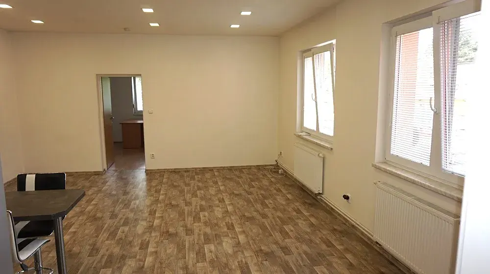 Dispozice – obývací pokoj s kuchyňským koutem, samostatný neprůchozí pokoj, předsíň, koupelna se sprchovým koutem společná s WC, k dispozici sklep. Velkou výhodnou je možnost rozšíření o samostatnou místnost/kancelář 15 m² se samostatným vstupem ze zahrady vhodný jako další samostatná obytná místnost nebo skladový a úložný prostor.