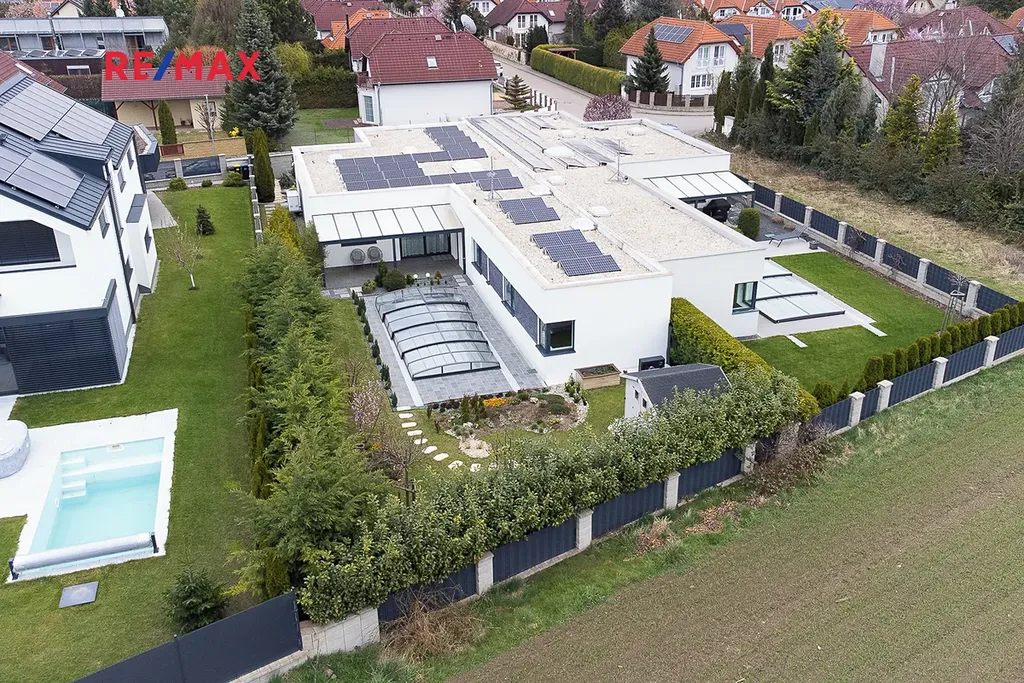 Nově nabízíme k prodeji exkluzivní přízemní novostavbu situovanou v malebné lokalitě Hovorčovic těsně za hranicemi Prahy. Jedná se o opravdu unikátní luxusní dům s fotovoltaikou, která pokryje až 100 % celkové spotřeby včetně vysokopříkonových spotřebičů – skutečná energetická soběstačnost.
