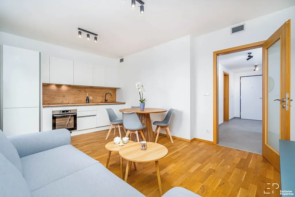 Byt je nově zařízený a připravený rovnou k nastěhování. V obývací části najdete sedací soupravu, TV stolek, jídelní stůl a plně vybavenou kuchyňskou linku se spotřebiči (varná deska, lednice, myčka, trouba, digestoř).