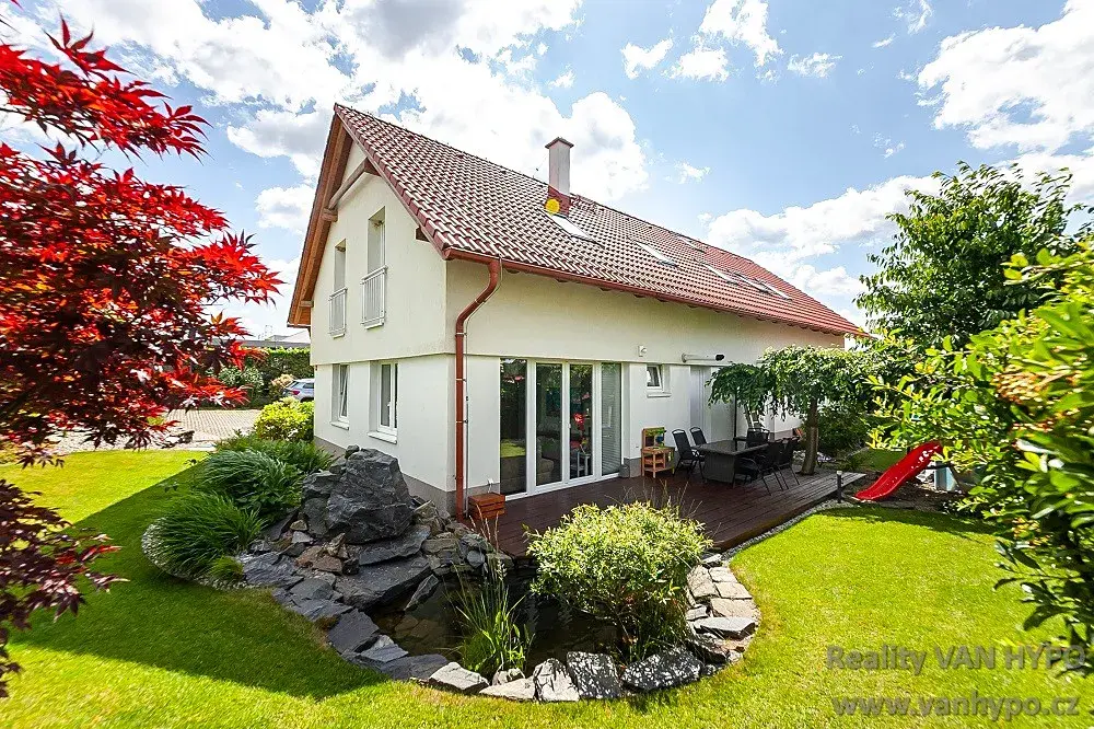 Světlý, nadstandardně řešený mezonetový byt 4 + kk s udržovanou předzahrádkou (150 m2), zahradním jezírkem, parkovacím stáním a praktickou dispozicí v klidné zástavbě rodinných domů.