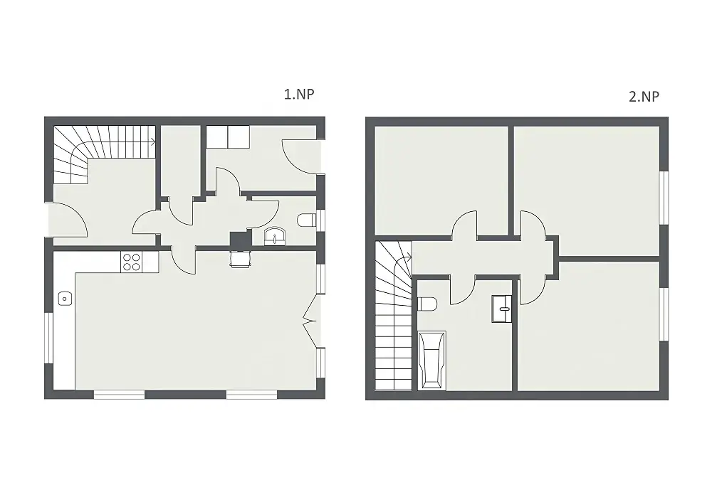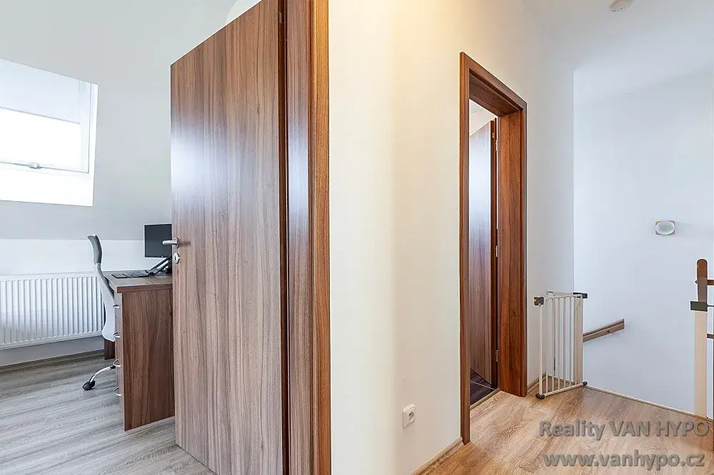 Dispozice moderně řešeného bytu nabízí novému majiteli v 1. NP prostornou vstupní chodbu, světlý obývací pokoj s možností instalace krbových kamen a s pohodlným vstupem na předzahrádku, kompletně vybavenou kuchyň se spotřebiči TEKA, šatnu, technickou místnost se vstupem na zahradu a samostatnou toaletu s umyvadlem. Ve 2.NP jsou pak k dispozici 3 pokoje, koupelna s vanou a toaletou.