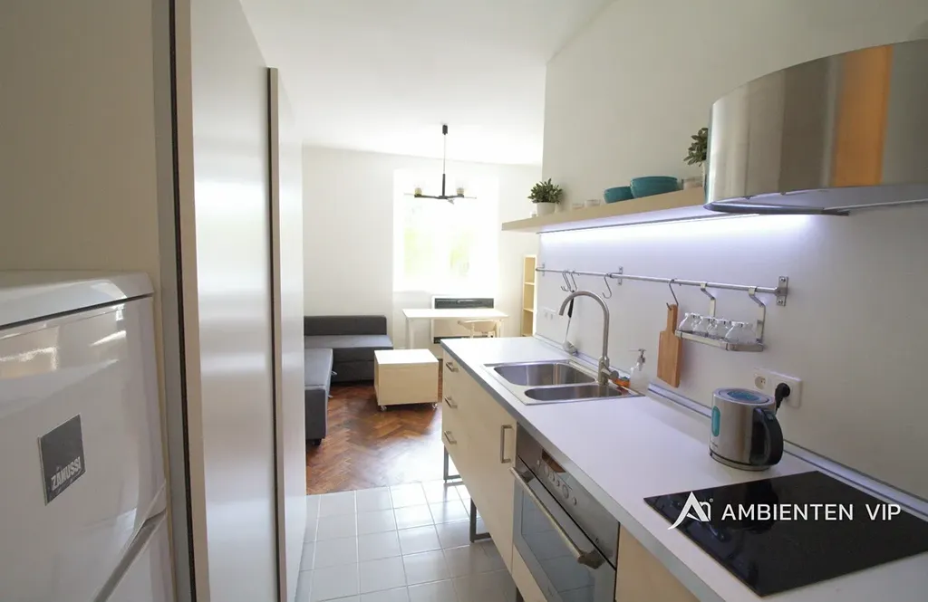 Hlavní obytný prostor přirozeně propojuje zónu pro odpočinek i každodenní život. Kuchyňská část je vybavena lednicí s mrazákem, indukční varnou deskou, troubou a mikrovlnnou troubou. Součástí vybavení je kompletní nábytek i pračka, takže byt umožňuje pohodlné nastěhování bez nutnosti dalších investic.