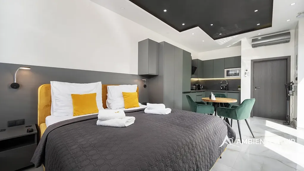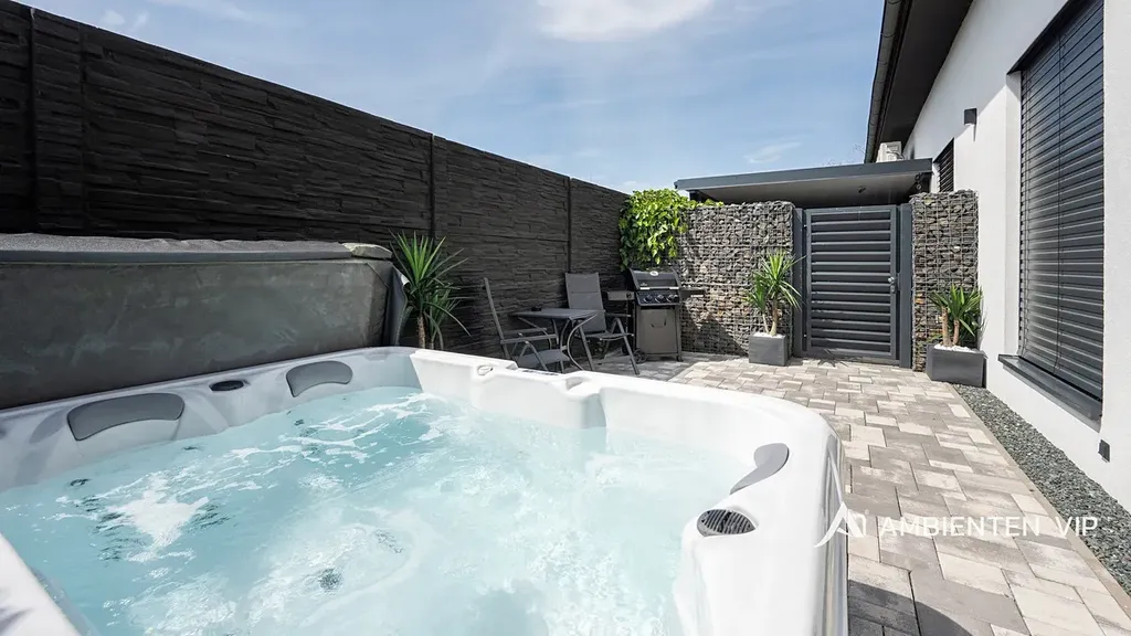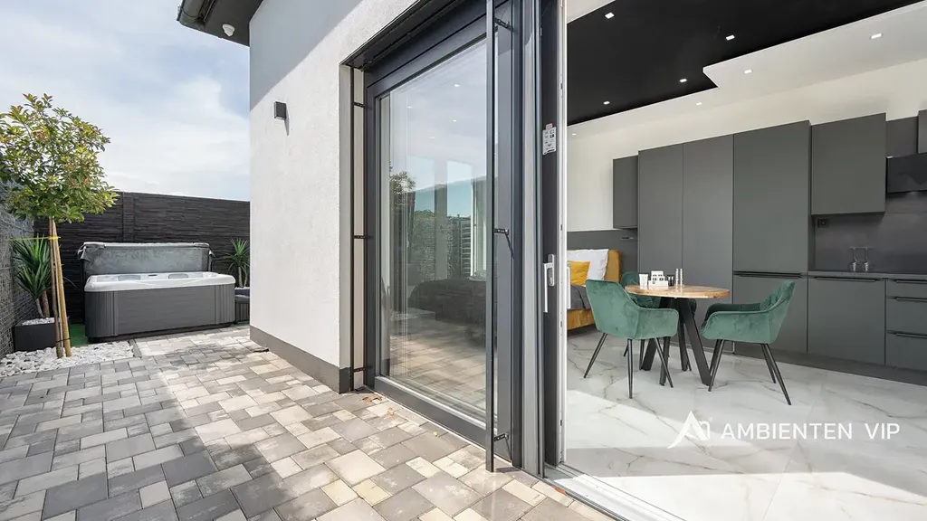 AMBIENTEN VIP exkluzivně nabízí pronájem luxusní bytové jednotky 1+kk o výměře 26,88 m² s vlastní terasou o velikosti 28m2, vířivkou a grilem. Od května do října je nájemcům k dispozici i společný bazén. Parkování je zajištěné přímo před nemovitostí.