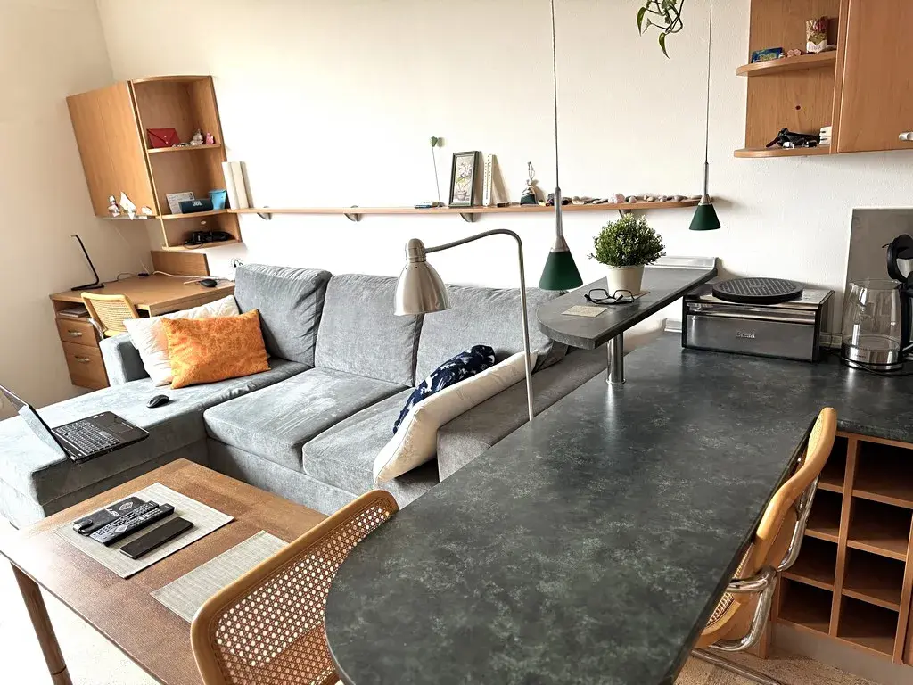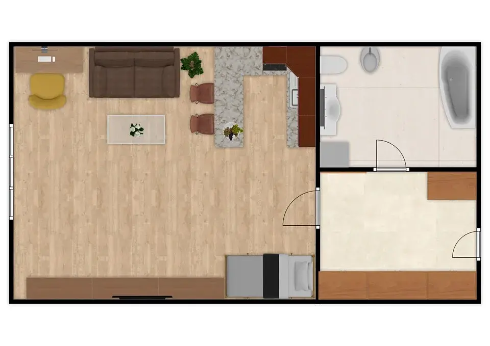 Poslední místnost bytu má přibližně 22,20 m2. V této místnosti nalezneme kuchyňský kout, který je vybaven indukční deskou značky Baumatic či mikrovlnnou troubou značky Whirlpool. Místnost je dále vybavena postelí, pracovním stolem a dalšími úložnými prostory. V této místnosti je zároveň umístěna klimatizace značky YORK, která je ideální pro horké letní dny.