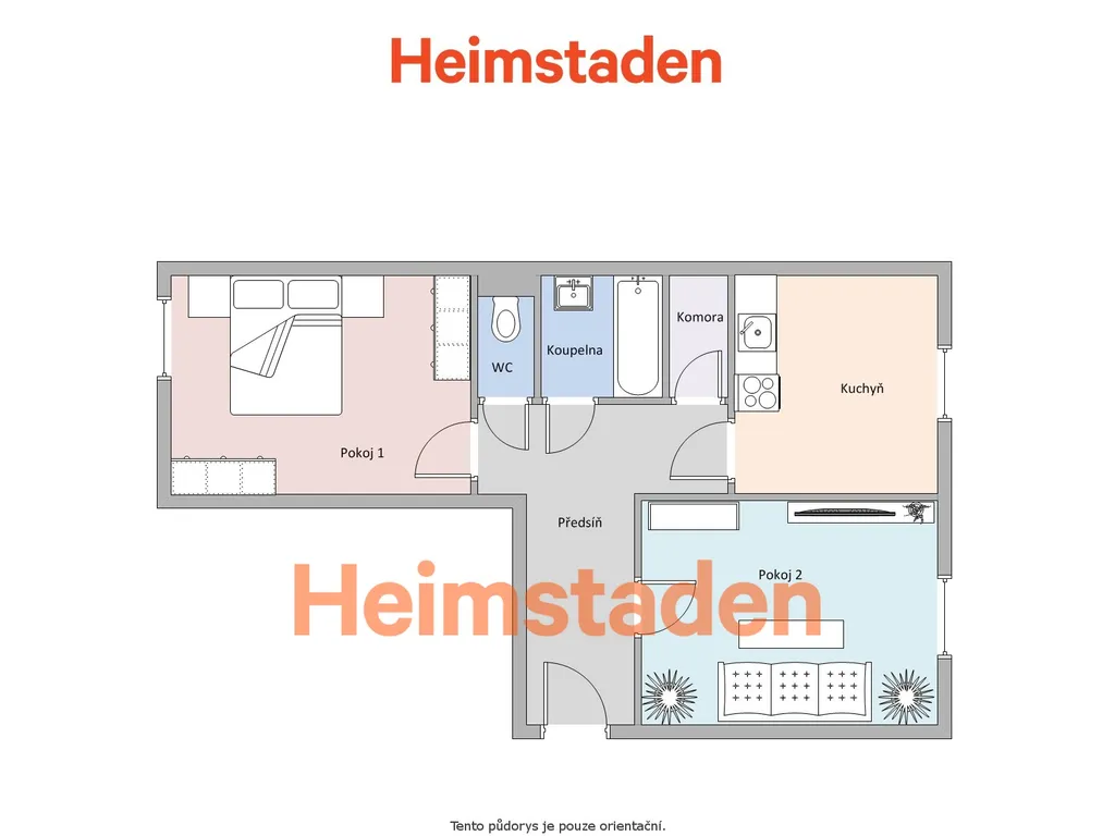 Obývací prostor je světlý a vzdušný, s plovoucími podlahami, které zdůrazňují eleganci a snadnou údržbu. Oba pokoje jsou samostatné, což zajišťuje maximální soukromí a pohodu pro všechny obyvatele.