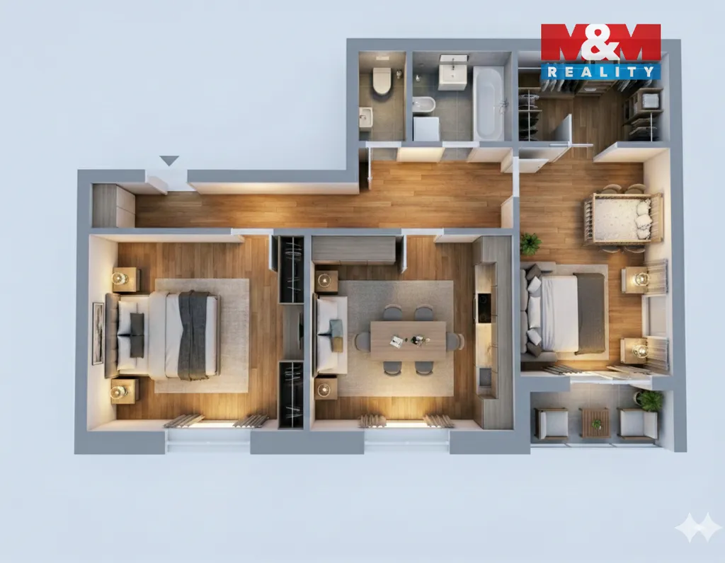 Nabízíme k pronájmu prostorný a velmi udržovaný byt 3+kk o ploše 82 m², který se nachází ve 3. patře cihlového domu. Interiér nabízí promyšlenou dispozici se dvěma samostatnými pokoji, přičemž jeden z nich disponuje praktickou šatnou ukrytou ve skříni. Srdcem bytu je velkorysý obývací prostor s kuchyňským koutem. Koupelna je vybavena rohovou vanou pro váš maximální komfort, toaleta je oddělená.
