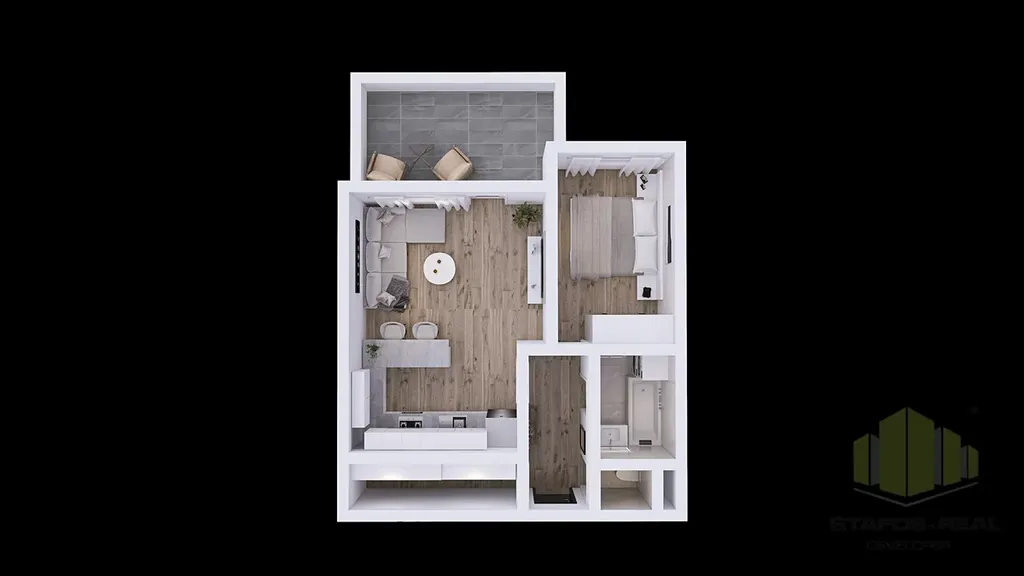 Byt se nachází v 1. nadzemním podlaží, má podlahovou plochu 55,5 m² a disponuje prostornou lodžií o výměře 11,4 m², přístupnou z obývacího pokoje. Celková plocha bytu činí 66,9 m². Byt je orientován na východ a jeho dispozice zahrnuje obývací pokoj s kuchyňským koutem, ložnici, vstupní halu, velkorysou šatnu, koupelnu a samostatné WC.