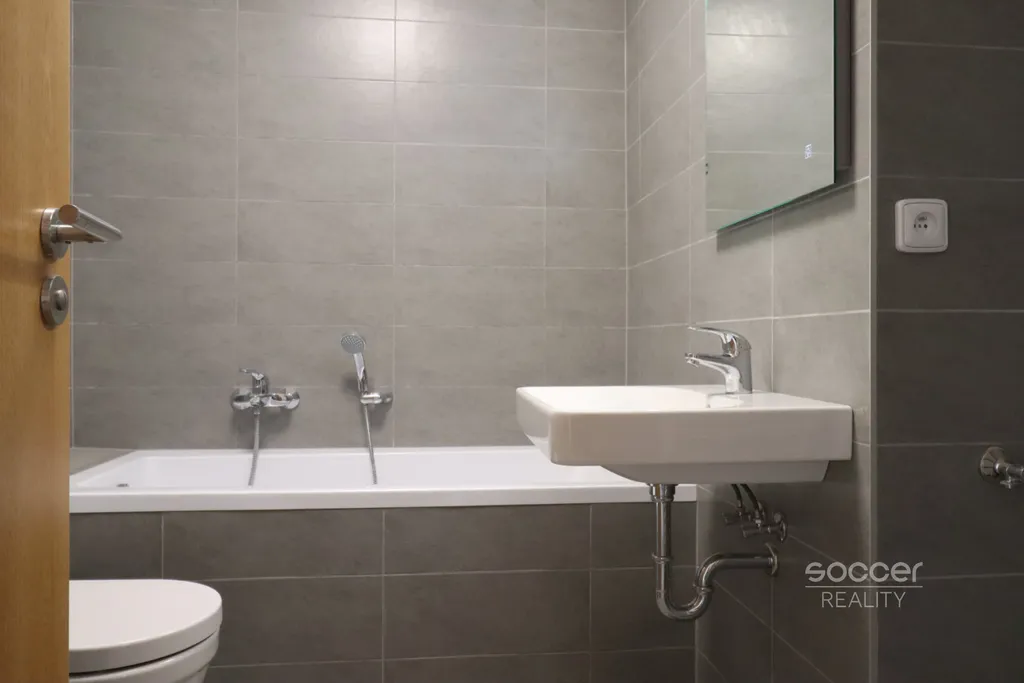 Součástí vybavení bytu je nová bílá kuchyňská linka, keramická varná deska, elektrická trouba, digestoř, lednice. Rovněž je k dispozici barový/jídelní stůl s přihrádkami a židlemi. V obou bytových místnostech jsou položeny laminátové plovoucí podlahy a do oken a dveří na balkon jsou nainstalovány vnitřní stahovací žaluzie. Hezká a prostorná koupelna je vybavena vanou a je společná s WC. Dlažba i obklady mají moderní šedou barvu. Vytápění bytu a ohřev teplé vody je centrální. Dostatek