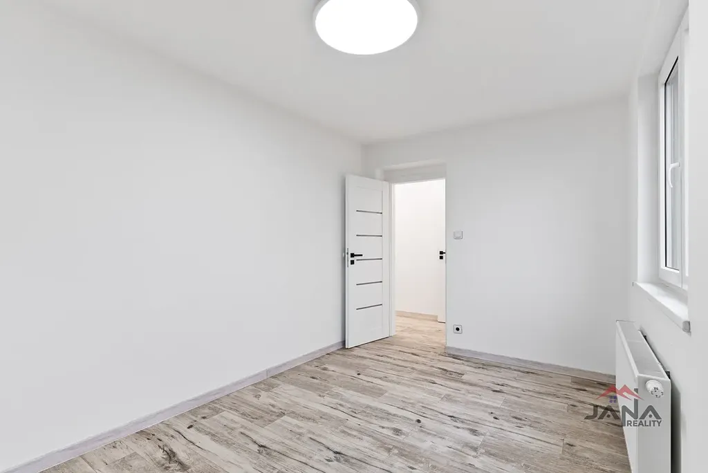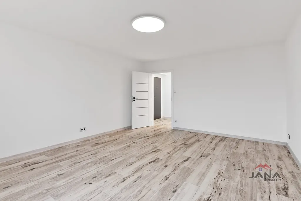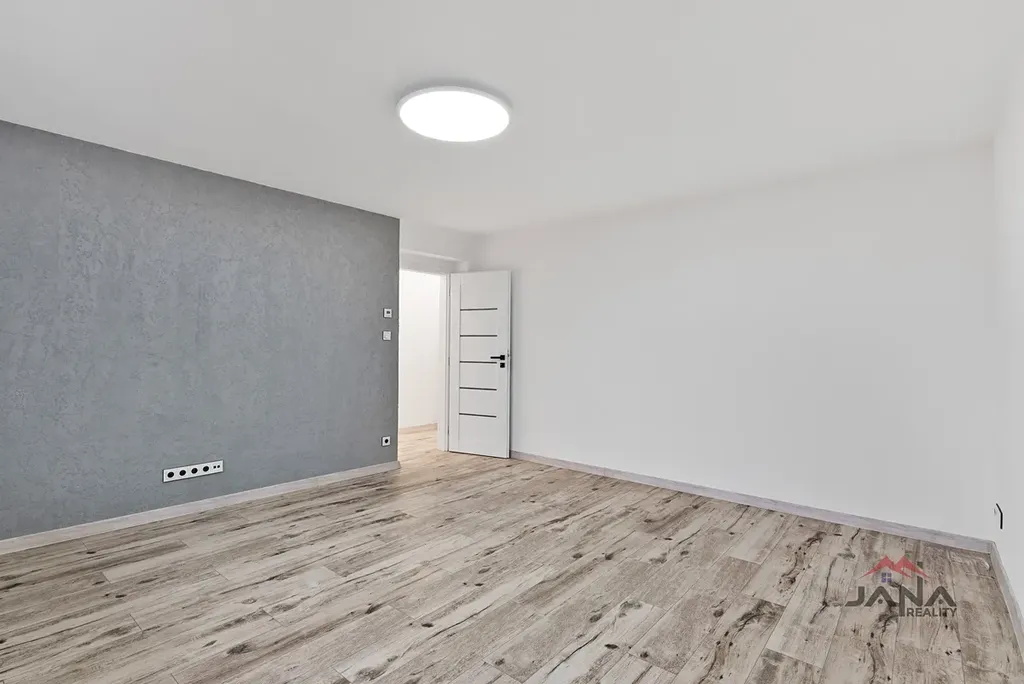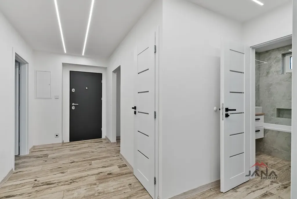Byt je osazen novými bezpečnostními vstupními dveřmi značky HT, novými interiérovými dveřmi s obložkami a LED podhledovým osvětlením se spínači ABB Levit. V celém bytě je položena dlažba, na stěnách v kuchyni, obývacím pokoji, koupelně a na WC je provedena betonová stěrka.