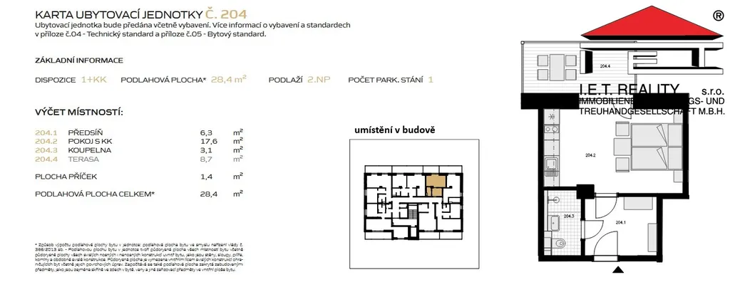 V apartmánu najdeme předsíň, pokoj s kuchýňským koutem za kterého se vcychází na terasu a koupelnu s toaletou a sprchovým koutem. Před budovou bude velká parkovací plocha s prvky zeleně a s 6 dobíjecími stanicemi pro elektromobily.