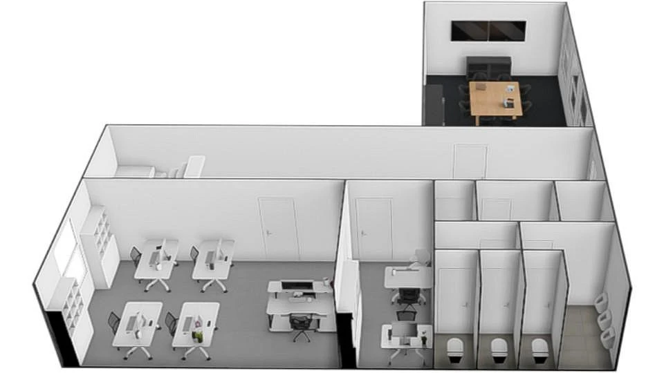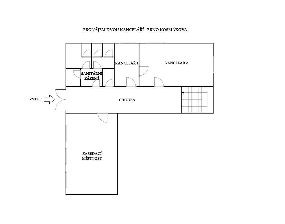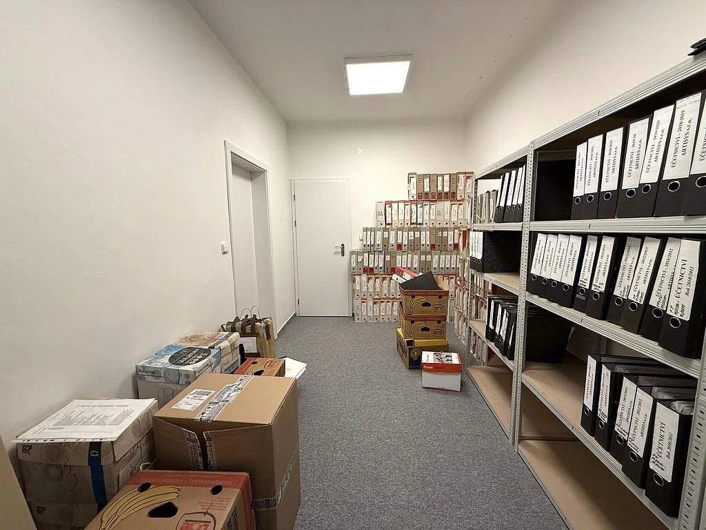 Jedná se o dvě samostatné kanceláře o velikosti cca 38 m² a cca 12 m², které se nachází v přízemí budovy. Větší místnost může sloužit jako hlavní kancelářský prostor a menší místnost jako zázemí pro další pracovní místo, archiv či sklad dokumentů. Obě místnosti jsou světlé. Hlavní kancelář je nově vybavena malou kuchyňskou linkou s dostatečným úložným prostorem a dřezem. Menší kancelář se nabízí bez vybavení. Na chodbě jsou společné prostory jako je WC nebo zasedací místnost, kterou si lze pronajmout za poplatek. Zasedací místnost je vybavena velkým stolem se židlemi, křesly, televizemi a dalším nábytkem včetně kuchyňské linky s dřezem a lednicí.