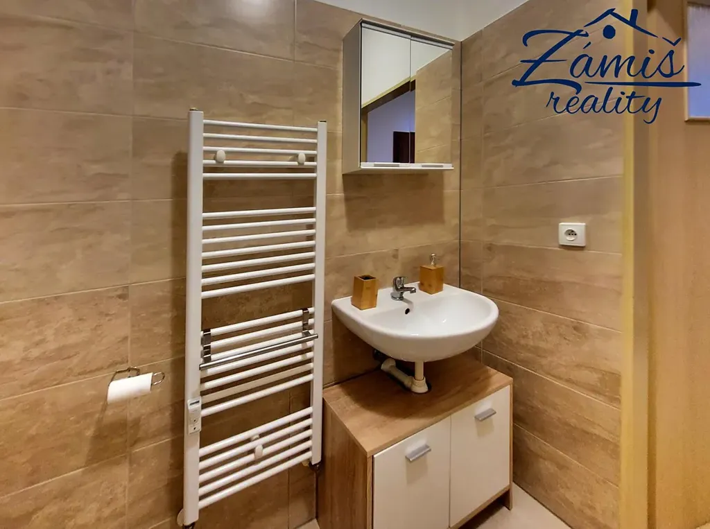 V koupelně si můžete užívat vanu, jsou zde nové koupelnové skříňky, umyvadlo se zrcadlem a WC.
