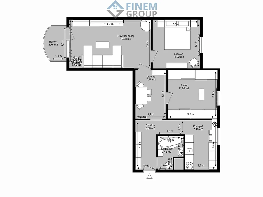 Dispoziční řešení: vstupní chodba se samostatnými vstupy do zděného bytového jádra s koupelnou a WC a dále do kuchyně. Chodba plynule navazuje na prostornou halu využitelnou jako jídelna či centrální obytný prostor, odkud vstupujeme do šatny a obývacího pokoje. Z obývací části vede vstup do ložnice, na lodžii s krásným otevřeným výhledem do okolí, který zajišťuje dostatek světla a příjemnou atmosféru po celý den.