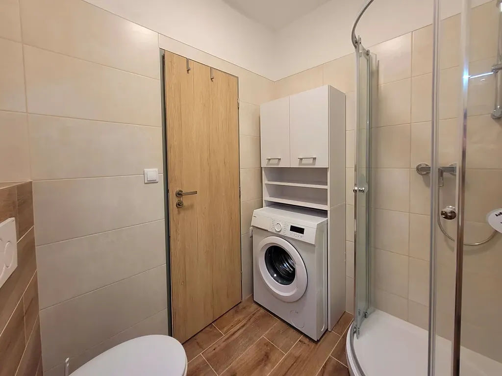 Ateliér je připraven pro prvního nájemníka. Součástí vybavení je kuchyňská linka s varnou deskou, digestoří, lednicí a mikrovlnnou troubou, jídelní stůl se židlemi, úložné prostory a spací část s lůžkem. Koupelna je vybavena sprchovým koutem, toaletou, umyvadlem se zrcadlovou skříňkou a pračkou. Interiér působí světlým, čistým a moderním dojmem a nabízí prakticky řešený prostor.