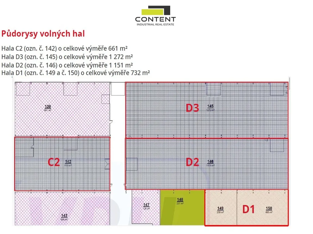 - v areálu k dispozici prostory, až 2423 m² (hala D2 1151 m² a hala D3 1272 m²)