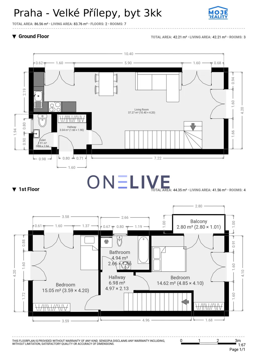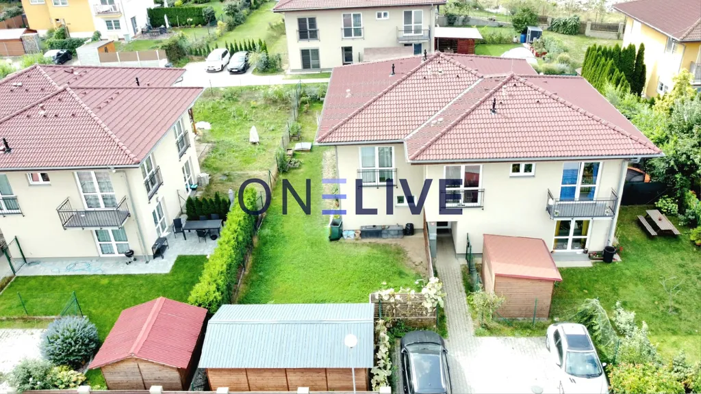 Byt se rozkládá ve dvou podlažích a přesné dispozice bytu tvoří v přízemí chodbu, samostatnou toaletu, prostorný obývací pokoj s designovým schodištěm a kuchyňským koutem (včetně spotřebičů). V patře naleznete chodbu, ložnici, dětský pokoj a koupelnu s druhým WC a jako bonus je v podkroví půda, která slouží jako úložný prostor. Absolutní dominantou je krásná a velká zahrada s krytou terasou ideální pro relaxaci v teplých letních večerech. Na pozemku dále naleznete 18m2 zahradní domek, který pojme nesčetné množství zahradní a sportovní techniky.