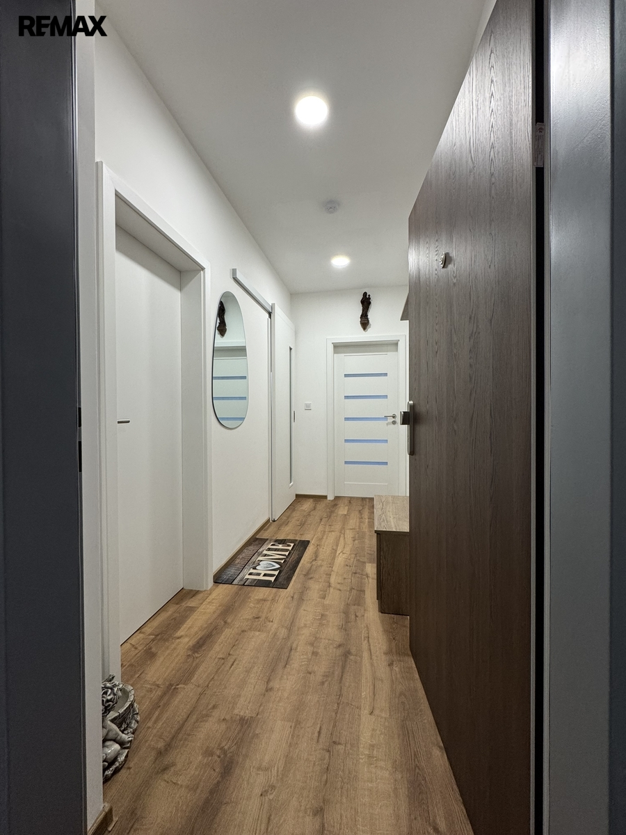 Dispozičně byt nabízí dva obytné pokoje (23,5 m² a 12,6 m²), koupelnu s vanou, samostatné vyhřívané WC se sprškou, předsíň, komoru/šatnu se skříněmi a terasu, která příjemně rozšiřuje obytný prostor. Byt je kompletně zařízený, viz fotogalerie inzerátu. Podlaha vinyl.