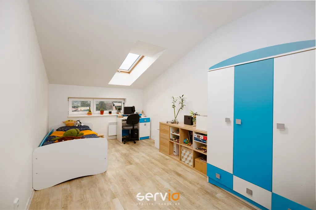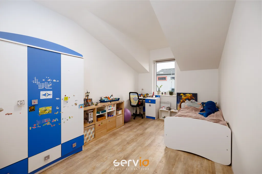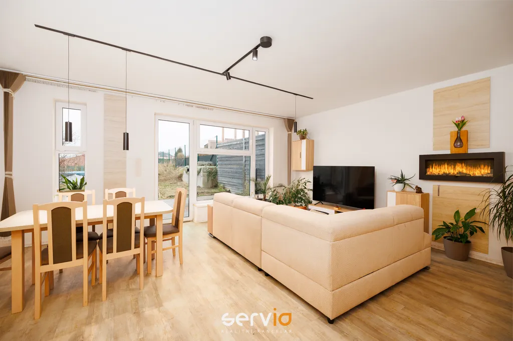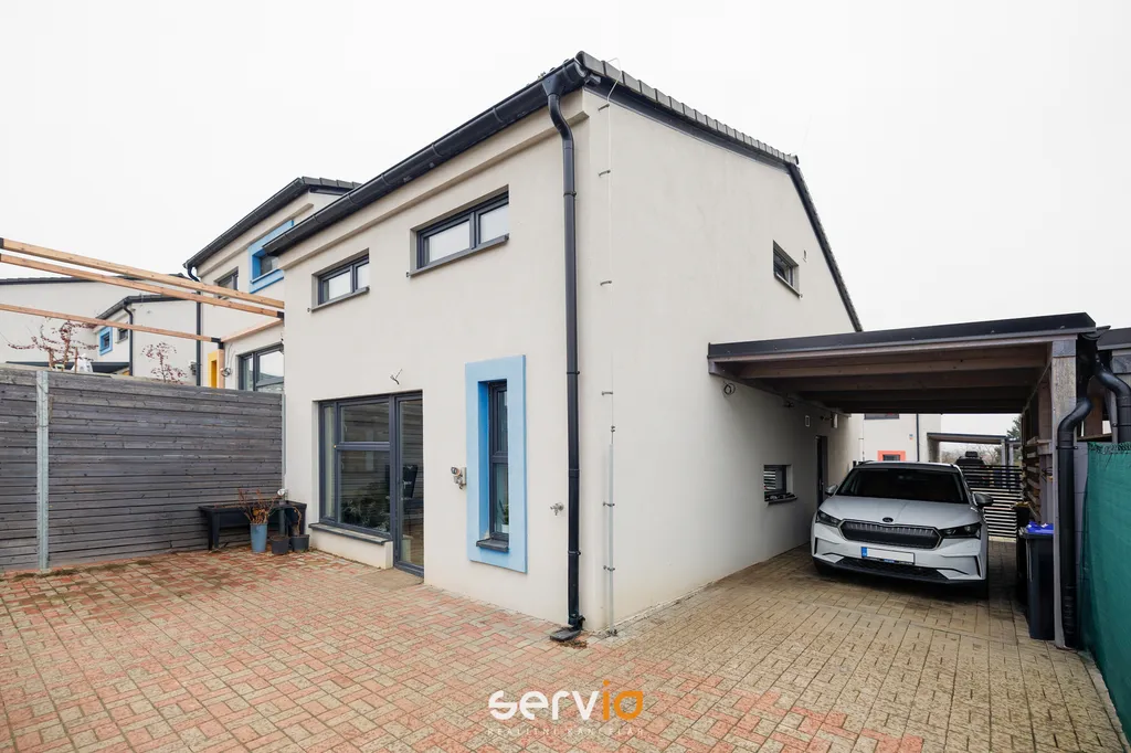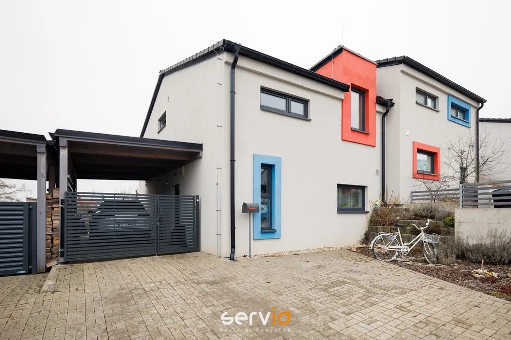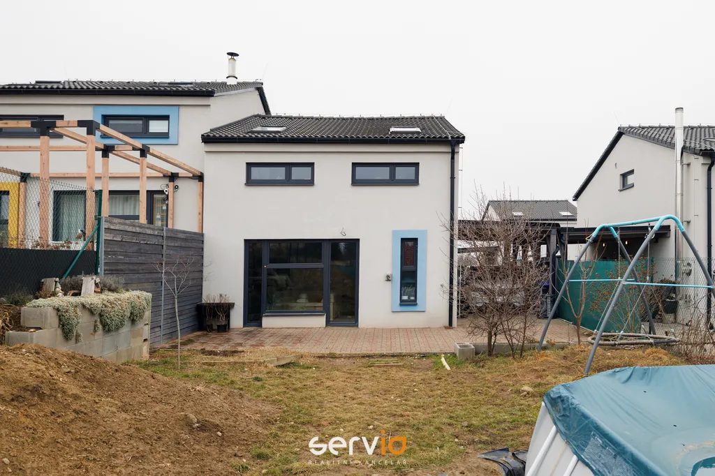 Jedná se o patrový dům o 2.NP v blokové zástavbě rodinných domů mimo hlavní ulici. V přízemí se nachází obývací pokoj s kuchyňským koutem, vstupem na zahradu s terasou, pracovna a WC. V patře zbývající 4 pokoje a koupelna s vanou a WC. Možnost parkovaní na vlastním pozemku až pro 3 auta, z toho 1 kryté za uzamykatelnou bránou.