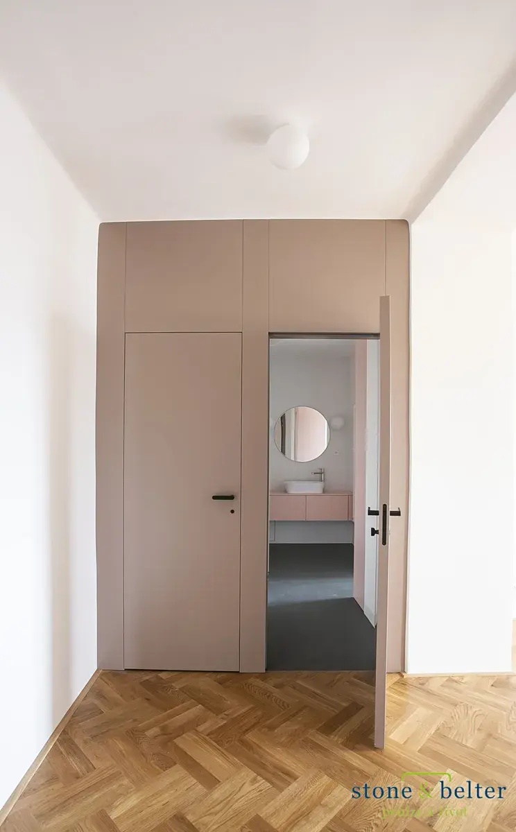 Byt je k pronájmu bez vybavení – zůstává vestavné vybavení a prvky na míru.