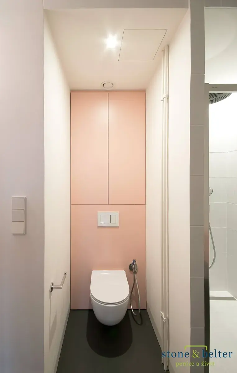 Úložné prostory řeší vestavné skříně s vnitřním osvětlením, příjemným detailem jsou dveře s magnetickým zámkem.