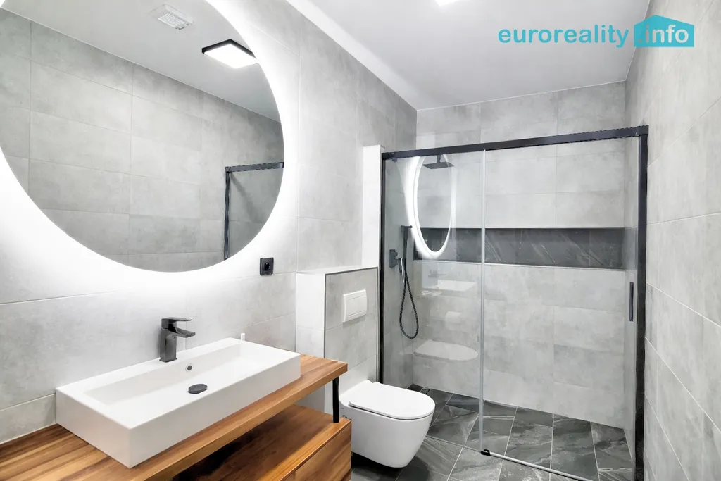 Dominantou interiéru je moderní kuchyňská linka vybavená myčkou, troubou, mikrovlnnou troubou, varnou deskou, digestoří a americkou lednicí. Koupelna nabízí prostorný sprchový kout a nadčasové provedení. V ložnici jsou vestavné skříně poskytující dostatek úložného prostoru.