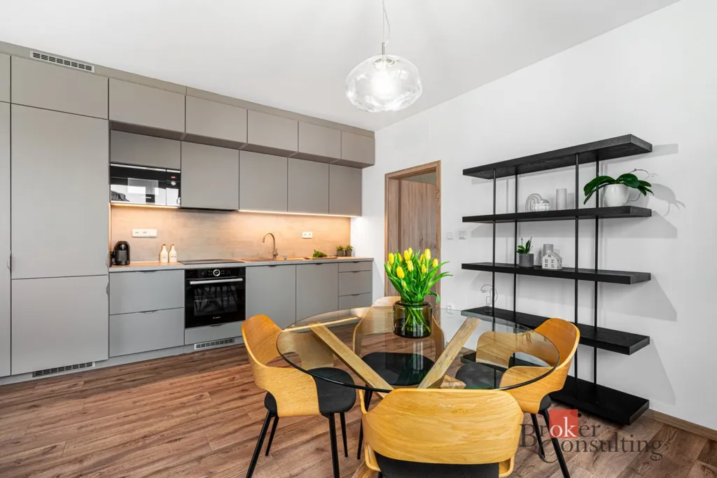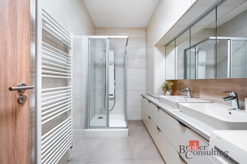 Dominantou bytu je prostorný obývací pokoj s kuchyňským koutem, který tvoří přirozené centrum celého bytu. Moderní kuchyňská linka je součástí vybavení a nabízí dostatek úložného i pracovního prostoru. Dvě samostatné ložnice poskytují maximální soukromí a klid, přičemž vestavěné skříně elegantně řeší úložné prostory bez narušení designu interiéru. Byt dále nabízí prostornou koupelnu s vestavným nábytkem na míru a sprchovým koutem s hydromasážním panelem Astrea, samostatné WC s bidetovou sprchou.