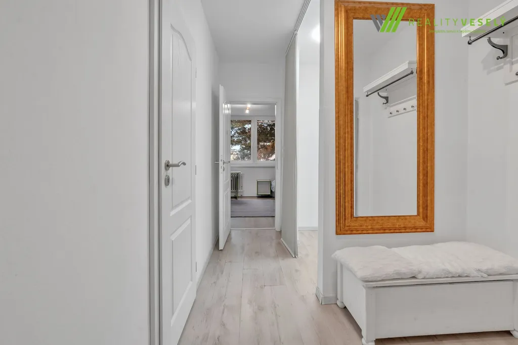 Hned po vstupu vás uvítá prostorná chodba, která nabízí velkorysý prostor pro šatnu či vestavnou skříň. Z chodby je přístupná moderní koupelna s vanou, umyvadlem, toaletou a vyhrazeným místem pro pračku i sušičku. Přímo z chodby se rovněž vstupuje do samostatného, neprůchozího dětského pokoje.