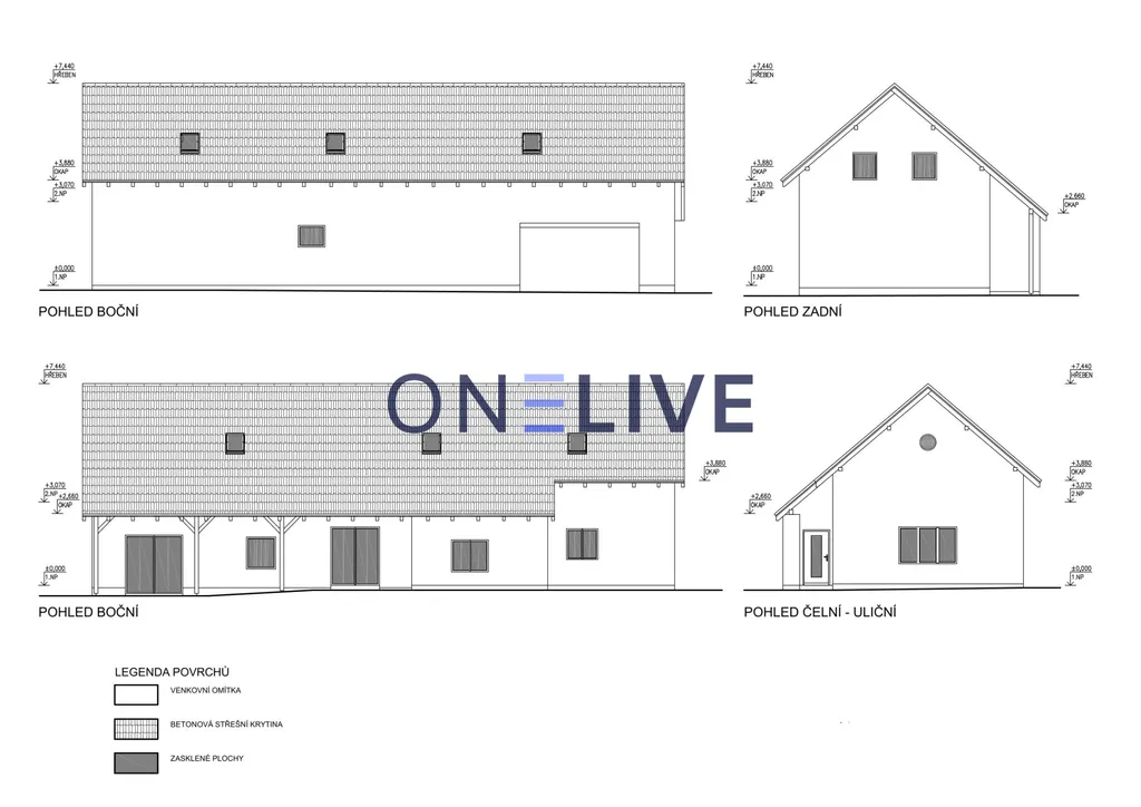 plastová okna trojskla, venkovní rolety s kaslíky ve fasádě (elektricky ovládané), el. střešní okna v průhledu