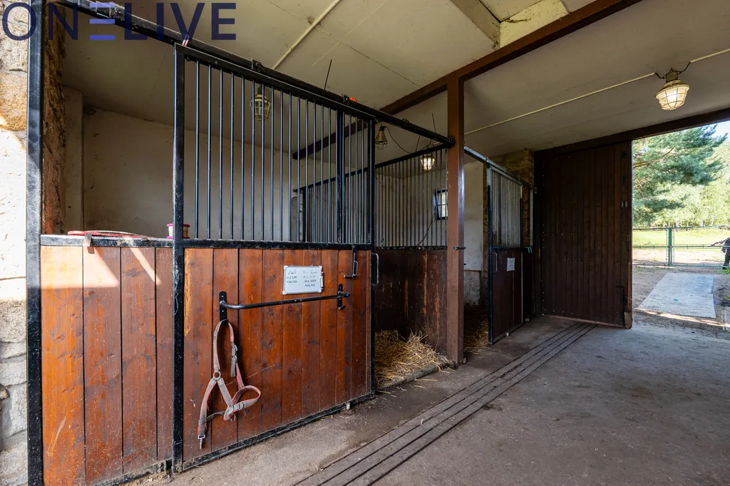 Součástí areálu je druhá budova se stájí — 4 boxy, sedlovna, krmírna a automatické napáječky. Může sloužit pro koně, ale stejně dobře jako dílna, garáže, ateliér či dokonalý pánský klub, kam by – jako na Karlštejn – ženám byl vstup zakázán a tajemství by přikryl dým z kvalitních doutníků.