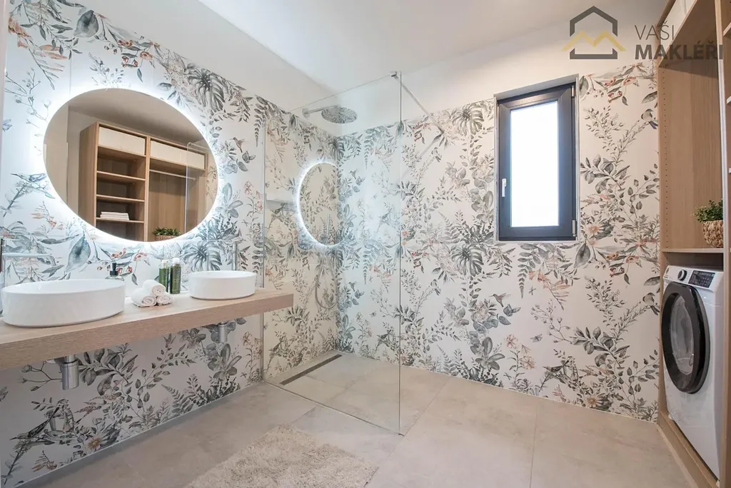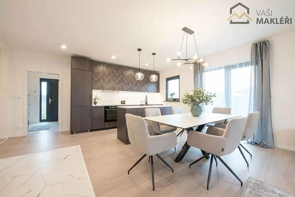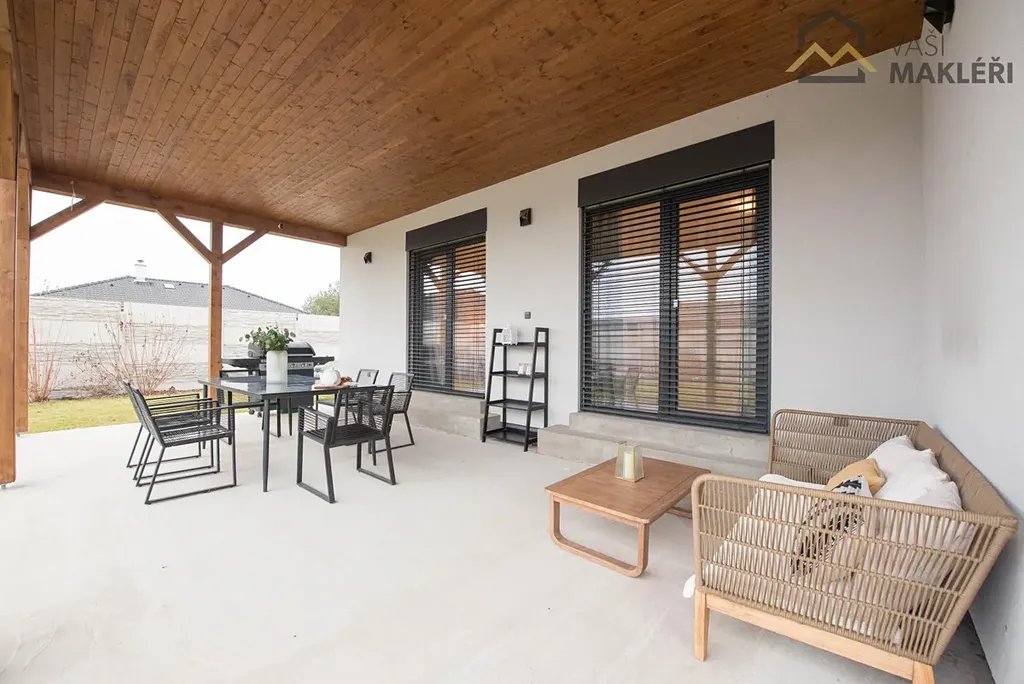 Oblíbenému dispozičnímu řešení 4+kk dominuje prostorný obývací pokoj s francouzskými okny, které propojuje interiér nemovitosti s udržovanou zahradou a také umožňuje vstup na zastřešenou terasu, která je v letních měsících dalším obytným prostorem. Na míru zhotovená kuchyňská linka je plně vybavena vestavěnými spotřebiči a chytře odděluje kuchyňský kout od zbylé části obývacího pokoje. Nemovitost dále disponuje třemi ložnicemi s rozdílnými výměrami. Prostorná koupelna je vybavena sprchovým koutem, dvěma umyvadly a toaletou. Propojovací chodba, zádveří a sklad poskytují dostatek místa pro úložné prostory (pro skladování sezónních věcí lze využít i pochozí prostor na půdě) a druhá toaleta je samozřejmostí. Součástí domu je i technická místnost se samostatným vstupem. V rozložení jednotlivých místností se nejlépe zorientujete z půdorysu, který je součástí inzerátu nebo si dům projděte virtuálně, z pohodlí vašeho domova.