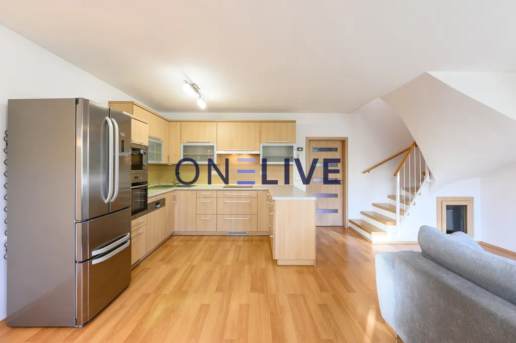V přízemí najdete světlý a prostorný obývací pokoj s kuchyňským koutem. Součástí je moderní kuchyňská linka s vestavěnými spotřebiči. Velká okna umožňují přístup přirozeného světla a vstup na terasu se zahradou. V obývacím pokoji je k dispozici rozkládací sedací souprava a obývací stěna. Dále se v přízemí nachází samostatná toaleta s umyvadlem, šatna, prádelna a garáž.