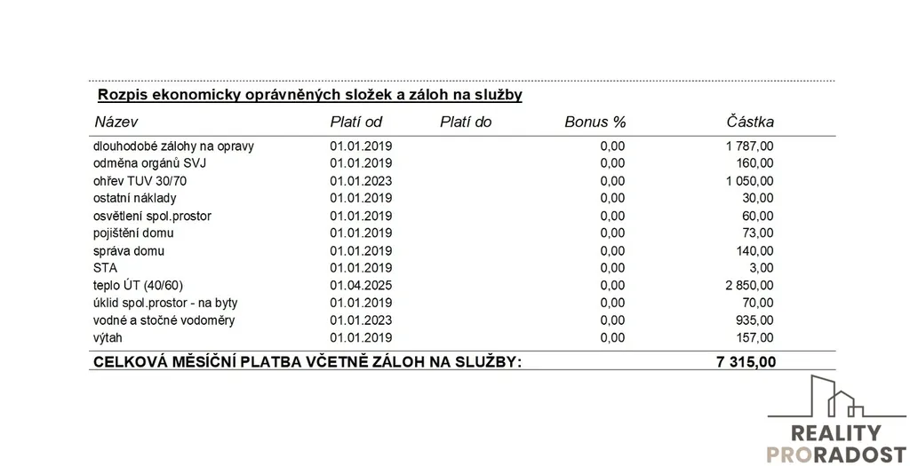 - náklady na bydlení 7.316 Kč z čehož fond oprav činí 1.787 Kč