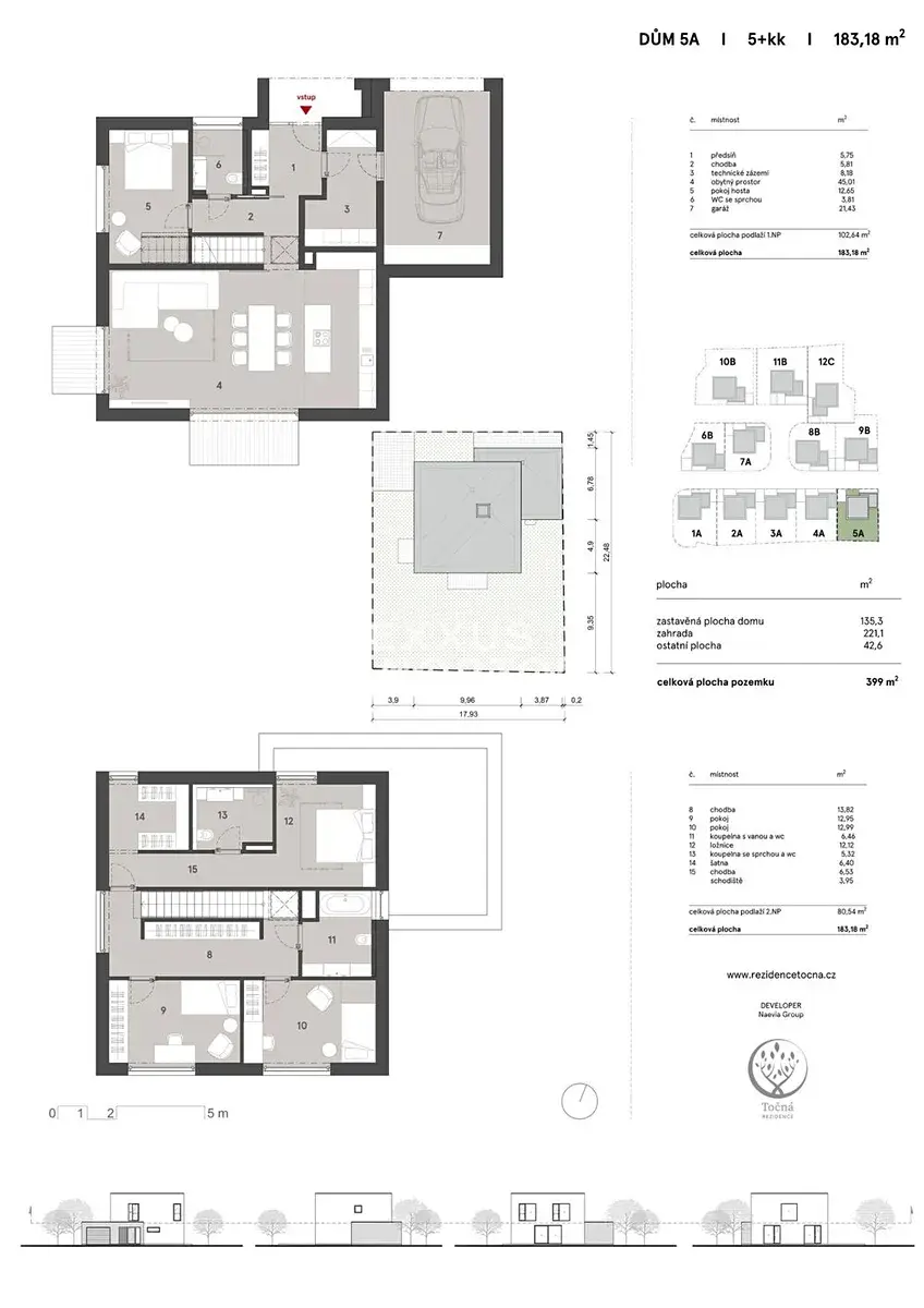 Celková užitná plocha dispozice 5+kk činí 183 m² a je účelně rozvržena do dvou nadzemních podlaží. Při vstupu se nachází prostorná hala s technickou místností a přímým vstupem do garáže, na ni navazuje otevřený obývací prostor s kuchyní a jídelnou o velikosti 45 m². Obytná část je vybavena velkoformátovými hliníkovými okny orientovanými na dvě světové strany, která přirozeně propojují interiér s terasami a jižně orientovanou zahradou. Na tomto podlaží je rovněž samostatný pokoj a koupelna, vhodné jako pracovna nebo pokoj pro hosty.