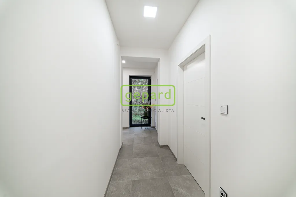 V celém bytě najdete mnoho nadstandardních prvků, jako je např. klimatizace a podlahové vytápění, což zaručuje spolu s tepelným čerpadlem velmi nízké náklady na provoz bytu. V koupelně se nachází místo pro pračku i sušičku, závěsné WC, vana a sprchový kout. Obě ložnice a předsíň pak nabízejí celou stěnu pro případné vložení vestavěné skříně pro maximalizaci úložného prostoru.