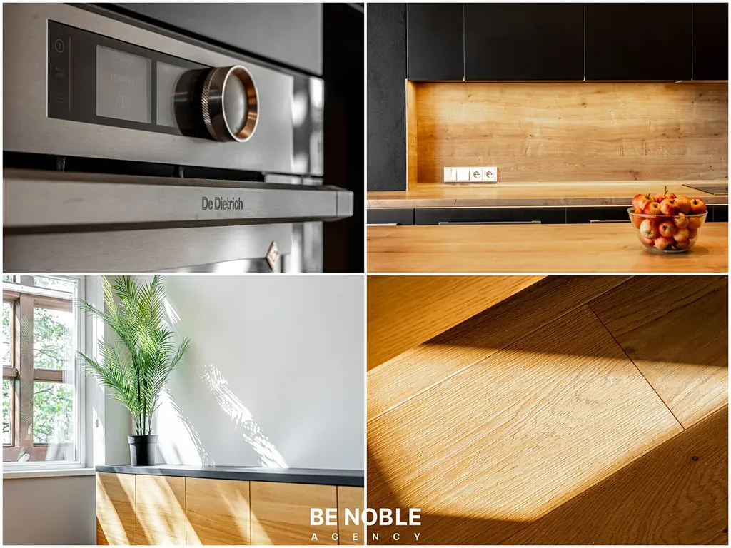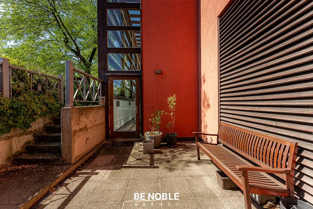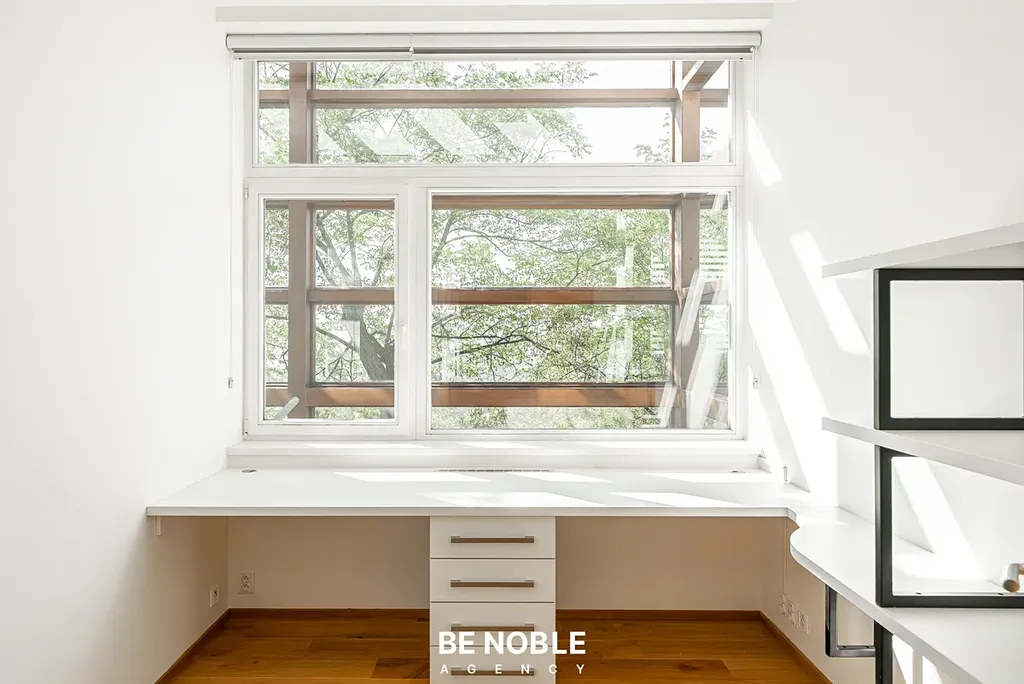 Vysoké stropy, velká okna a prosklená oranžerie s termofoliemi dodávají celému prostoru klid a harmonii. Díky této konstrukci, v kombinaci se vzrostlými stromy před okny, si byt udržuje příjemné klima – v létě chlad, v zimě teplo. Samozřejmostí je klimatizace a vnější žaluzie s velkými lamelami, které zajišťují nejen komfort, ale i soukromí.