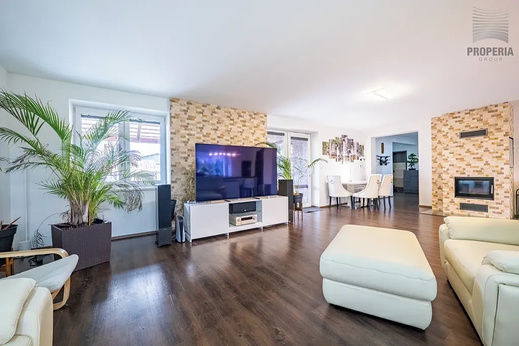 Srdcem domu je velkorysý obývací pokoj s kuchyňským koutem o ploše cca 63 m², ideální pro rodinný život i setkávání s přáteli. Prostor je světlý, vzdušný a nabízí přímý vstup na terasu, která přirozeně rozšiřuje obytnou část domu.
