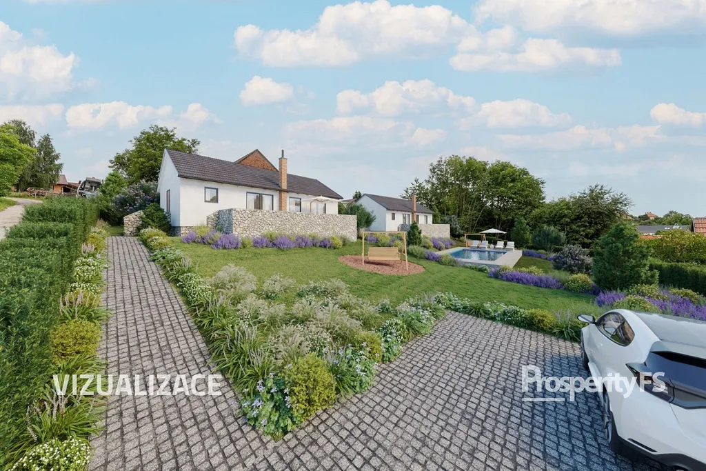 - Kompletní exteriér: Pozemek vám oplotíme a připravíme parkovací stání pro dvě auta i terasu ze zámkové dlažby.