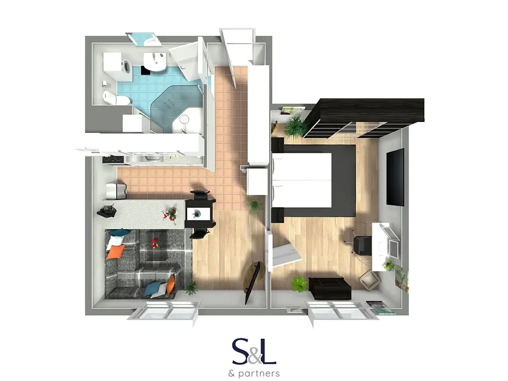 Dispozice bytu je prakticky řešena. Ze vstupní chodby se vchází do koupelny s toaletou, dále do kuchyně s jídelním či obývacím koutem. Samostatná místnost nabízí dostatek prostoru pro ložnici, případně kombinaci s pracovním koutem. Součástí bytu je podíl na balkoně v mezipatře a sklepní kóje.
