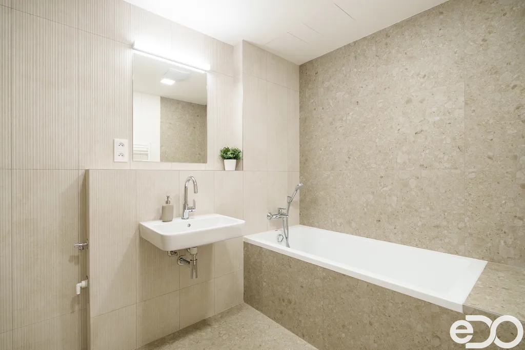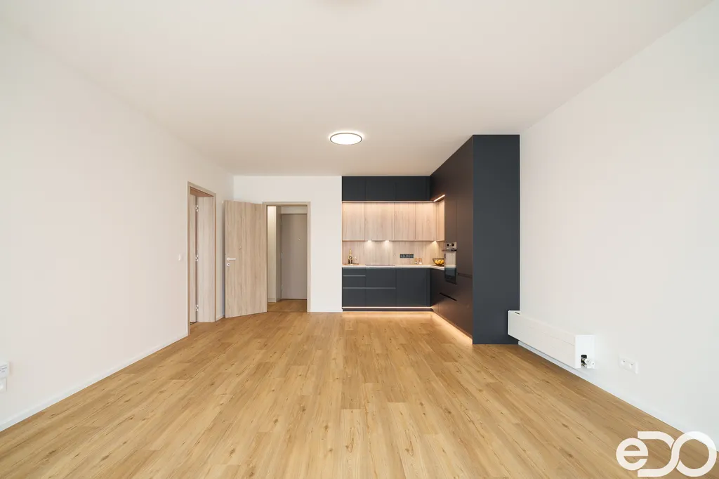 Byt se nachází v cihlové novostavbě a čeká na své první nájemníky. Moderní dispozice nabízí prostorný obývací pokoj s kuchyňským koutem, ložnici, předsíň, koupelnu s vanou a samostatnou toaletu s umyvadlem. Z obývacího pokoje i ložnice je vstup na lodžii o výměře 6 m², která poskytuje příjemné místo k relaxaci. Jednotka je orientována na jihozápadní stranu. Součástí bytu je moderní kuchyňská linka, která je vybavena veškerými spotřebiči: elektrická trouba, indukční varná deska, digestoř, myčka a lednice s mrazákem. V ložnici je k dispozici prostorná vestavěná skříň, v předsíni pak skříně s dalším úložným prostorem. Vytápění je zajištěno tepelným čerpadlem, stejně jako ohřev vody. Okna a dveře k lodžii jsou hliníková, podlaha pak vinyl a keramická dlažba. K bytové jednotce dále náleží zděný sklep (2,7 m²) a garážové stání, které je za příplatek 1 800 Kč měsíčně.
