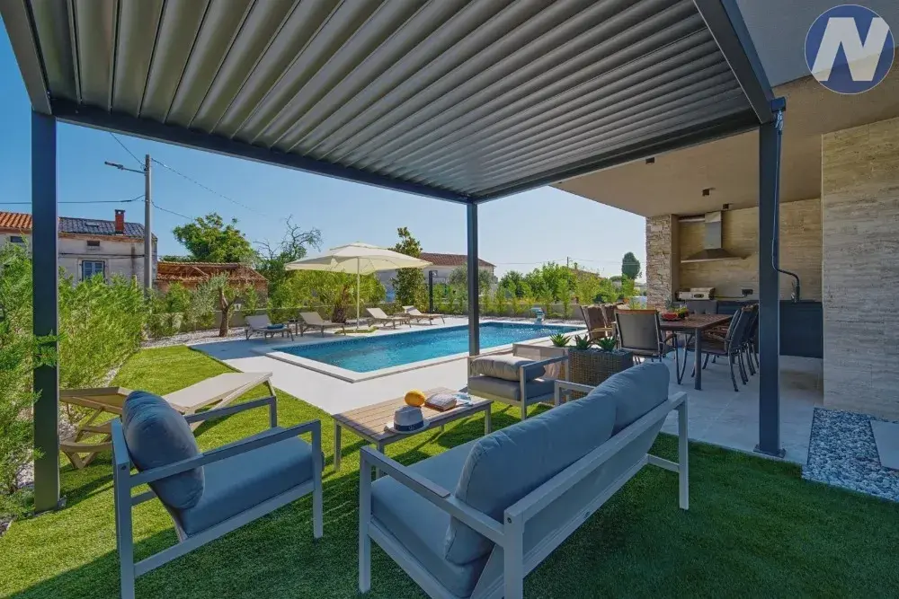 Nově postavená, moderní rodinná vila, která se nachází v klidné vesnici Marčana, ve východní Istrii, jen 4 km od moře a nedotčené přírodní pláže známé svou křišťálově čistou vodou a uvolněnou atmosférou, daleko od masové turistiky.