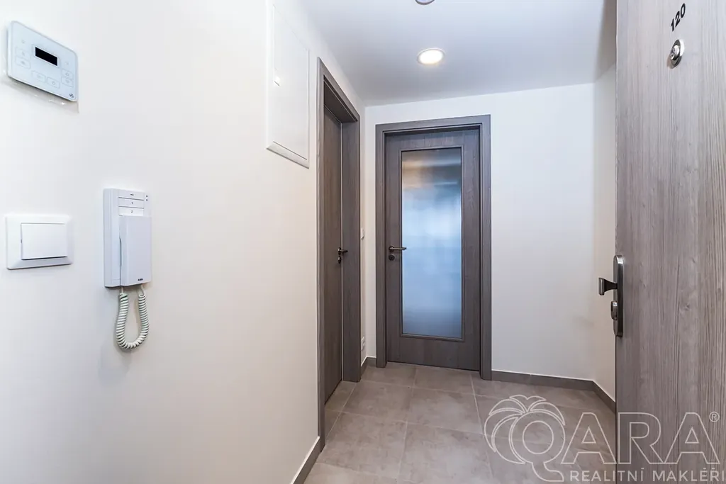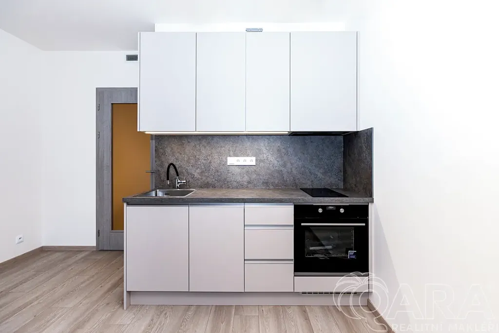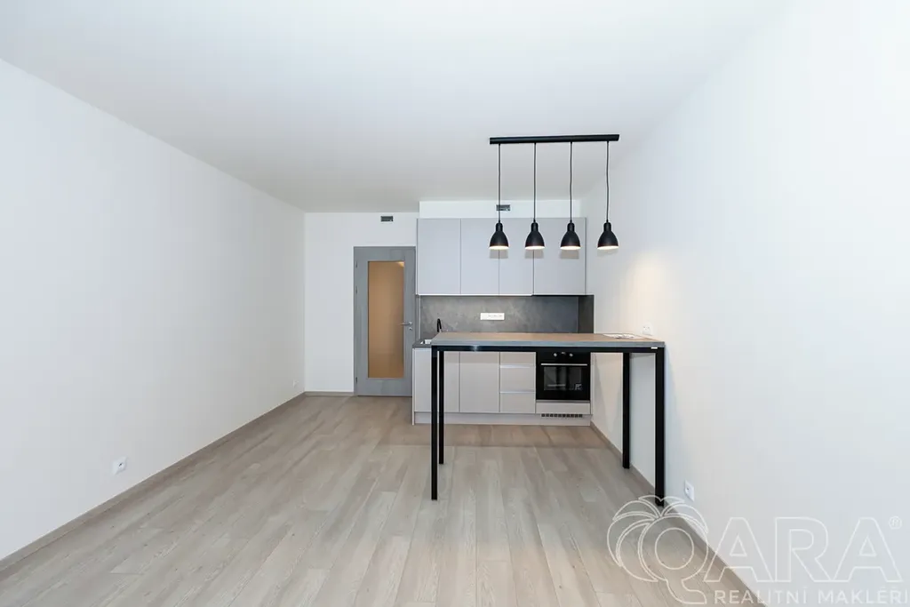 Byt je dispozičně členěn do vstupní chodby se šatní skříní, koupelny s toaletou, sprchovým koutem a pračkou, dále obytné místnosti s kuchyňskou linkou a vstupem do lodžie. Výhled z okna a vlastní lodžie orientovaná mimo rušnou silnici a tramvajovou trať. Součástí bytu je kuchyňská linka s jídelním stolem, robotický vysavač, modem pro připojení k internetu. Byt bude dovybaven velkou vestavnou skříní v předsíni a vestavnou lednicí a skříní v kuchyni. V ceně nájemného bytu je rovněž zahrnuta sklepní kóje v suterénu domu a kryté parkovací stání. Velmi nízké náklady (energetická náročnost B). Byt je vybaven rekuperací.