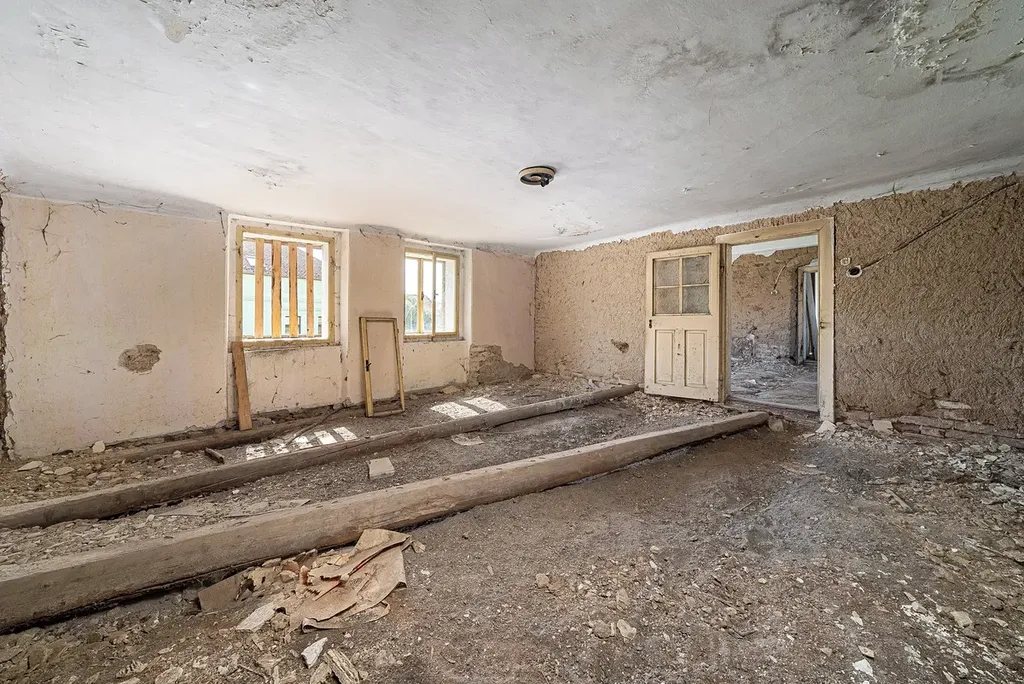 Interiér nyní zahrnuje vstupní chodbu, kuchyň, tři pokoje a přístavek. Dům má tradiční kamenné zdivo s nepálenými cihlami, trámové stropy a sedlovou střechu. Konstrukce je ve stabilním stavu – ideální základ pro novou vizi bez nutnosti zásadních stavebních zásahů.