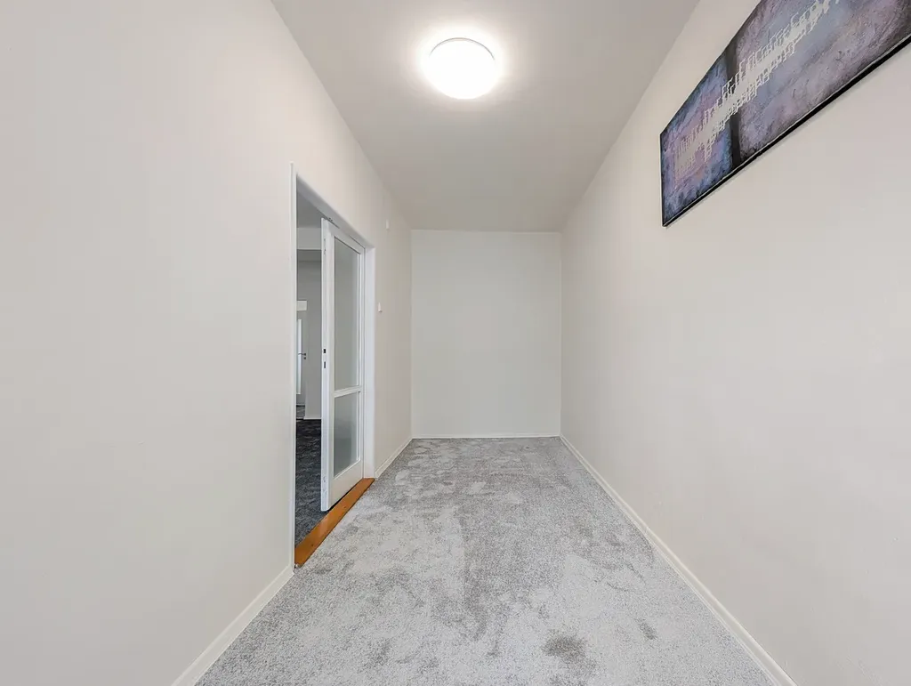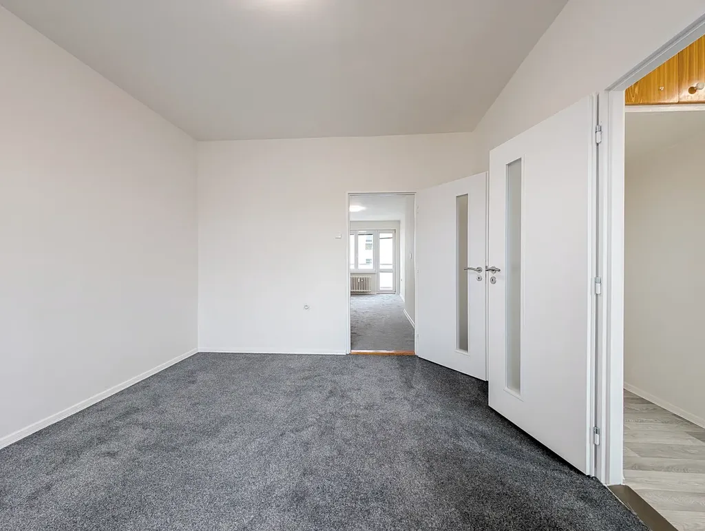 Dispozice je praktická – obývací pokoj, dvě samostatné ložnice, kuchyně, koupelna, samostatné WC a prostorná chodba.