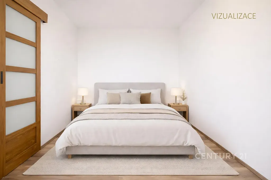 Obývací pokoj a ložnice jsou na fotografiích i vizualizovány pro lepší představivost.