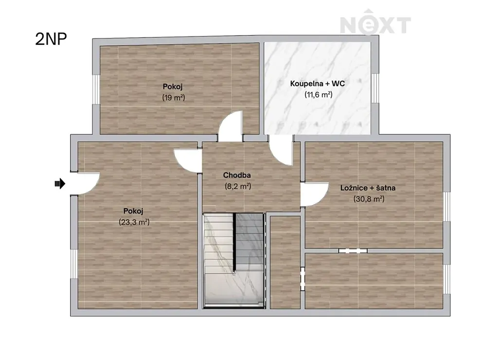 Ve druhém podlaží najdete klidovou zónu, a to tři neprůchozí pokoje, přičemž hlavní ložnice má vlastní šatnu. Dále koupelnu s vířivou vanou, toaletou a skříňkou se dvěma umyvadly - vše navrženo pro maximální komfort rodiny.