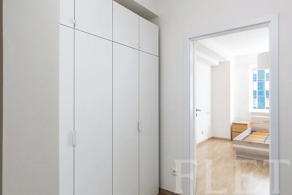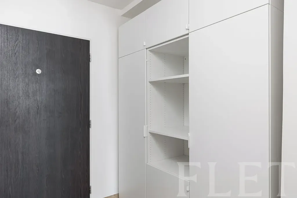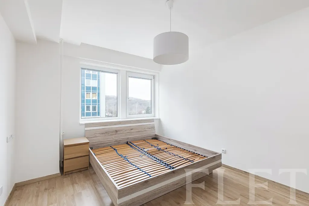 Dispozice bytu je velmi praktická a promyšlená. Ze vstupní chodby s vestavěnými skříněmi se dostanete do všech místností. Koupelna je vybavena sprchovým koutem a toaletou v moderním, nadčasovém standardu. Samostatná ložnice nabízí dostatek prostoru pro plnohodnotnou postel i úložné řešení. Hlavní obytná část je tvořena světlým obývacím pokojem propojeným s kuchyňským koutem a jídelním prostorem. Kuchyňská linka je v čistém designu, doplněná o vestavěnou troubu, varnou desku, myčku, digestoř i lednici. Velká okna zajišťují dostatek denního světla a příjemnou atmosféru. Celkově byt působí velmi vzdušně, čistě a je připraven k okamžitému užívání.