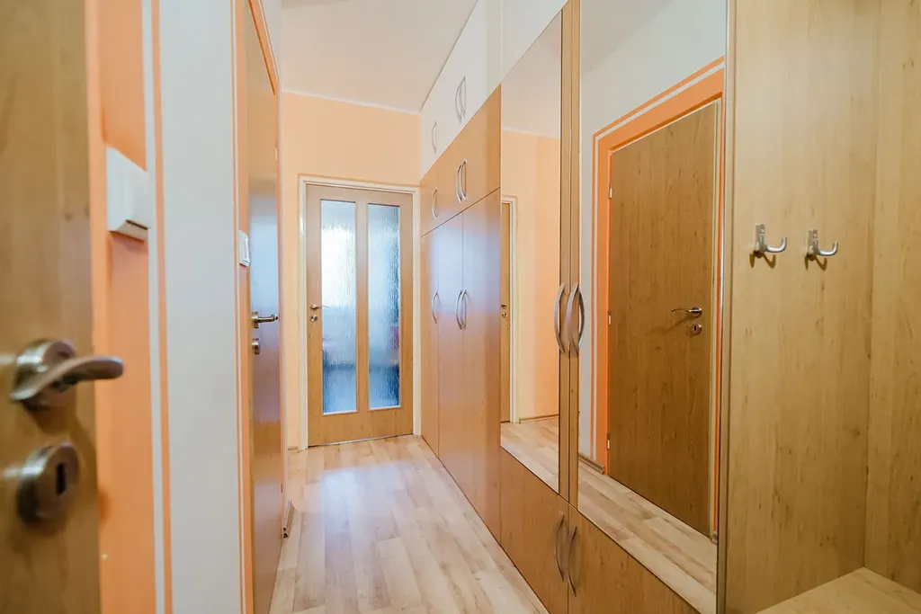 V bytě proběhla kompletní rekonstrukce – moderní kuchyně, nové plovoucí podlahy, interiérové dveře, koupelna s vanou a samostatná toaleta.