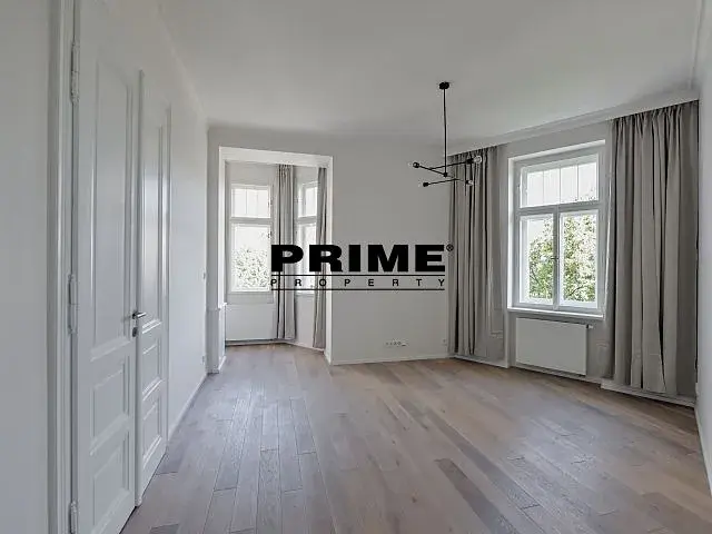 Kompletně zrekonstruovaný, exkluzivní, 2 ložnicový, klimatizovaný, ZAŘÍZENÝ byt se 2 koupelnami k pronájmu, 3+1, 139m2, s garážovým parkovacím stáním, situovaný ve 2. patře kompletně zrekonstruovaného secesního domu s výtahem.