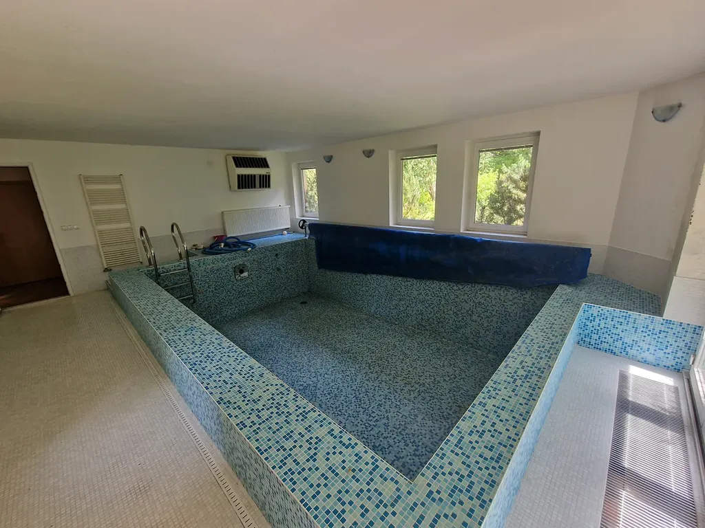 V přízemí domu instalován vnitřní bazén (5,35 x 3,45m s max. hloubkou 1,4m). Bazénová místnost disponuje zařízením na automatickou regulací PH.